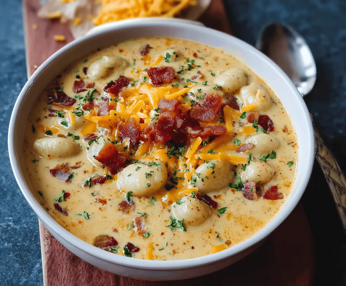 Enjoy this hearty, creamy soup that’s packed with cheesy gnocchi and savory bacon for a perfect comforting meal!