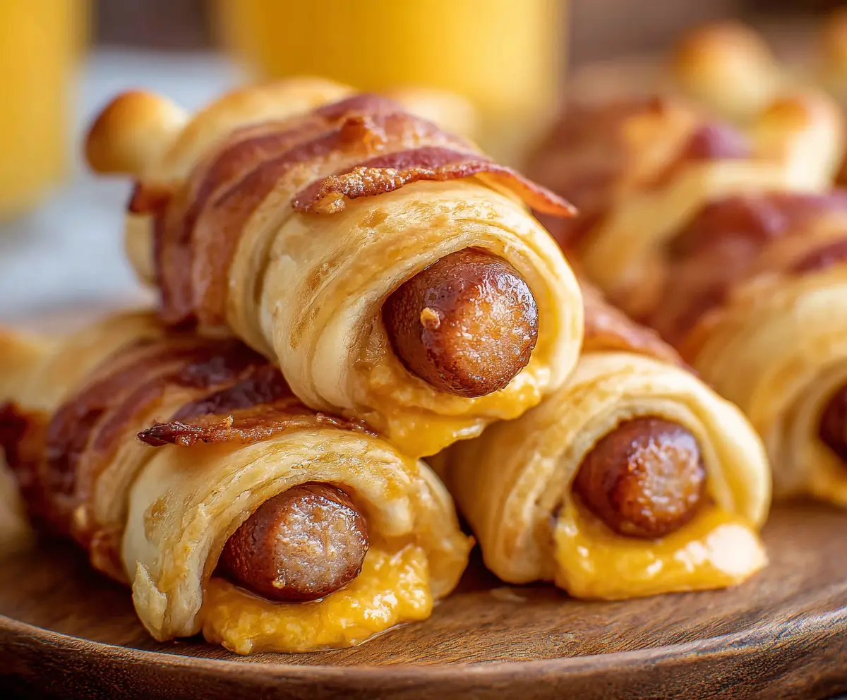 Once rolled, take a half strip of the crispy bacon and wrap it around each crescent-wrapped sausage. This step is key for that extra deliciousness!
