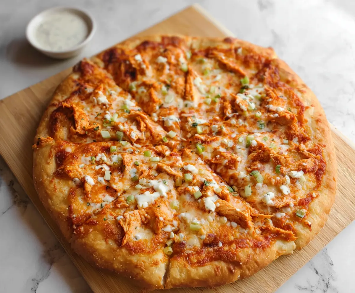 Let the pizza cool for a few minutes before slicing it into pieces. Serve warm, and enjoy your homemade Buffalo Chicken Pizza!
