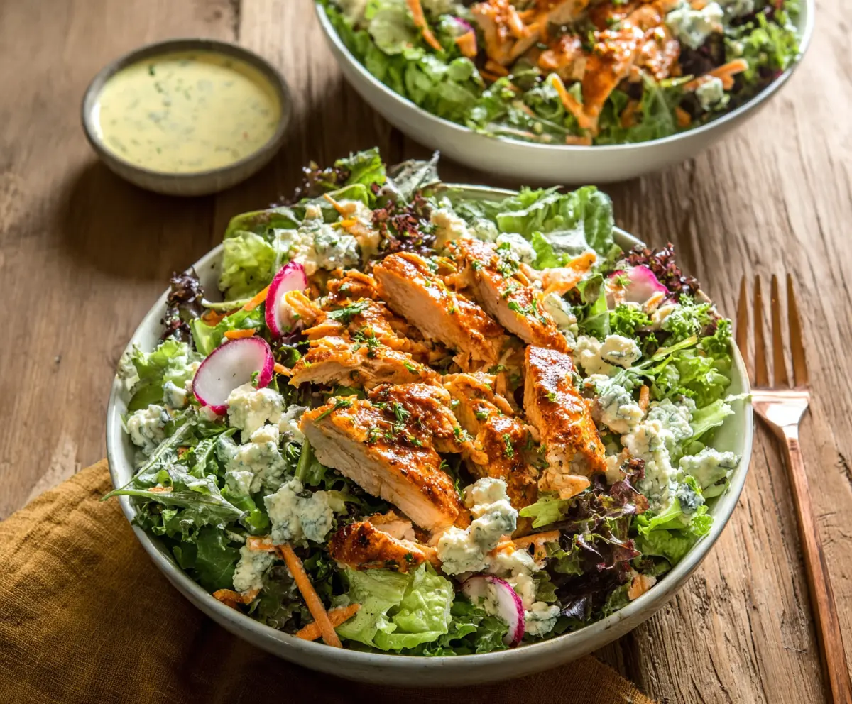 Serve the Buffalo Ranch Chicken Salad immediately while the chicken is still warm. Enjoy this hearty, flavorful meal that perfectly balances spicy, creamy, and crunchy textures!