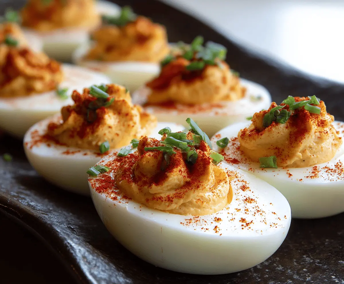 For the final touch, lightly dust the tops with smoked paprika for flavor and color, then sprinkle with chopped green onions for a fresh crunch.