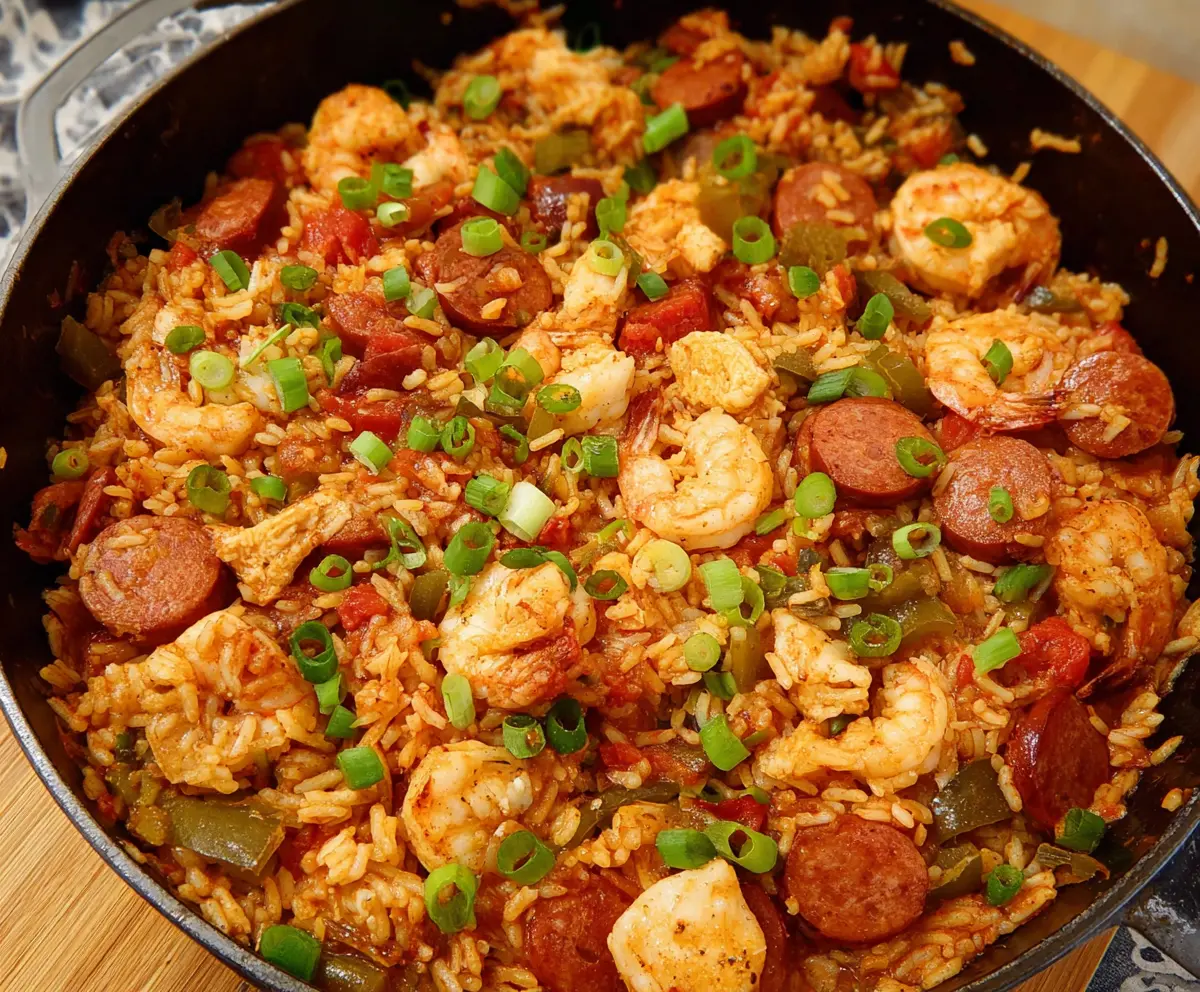 This recipe creates a comforting, flavorful dish filled with tender chicken, smoky sausage, juicy shrimp, and perfectly seasoned rice. Enjoy every bite of your homemade Cajun jambalaya!