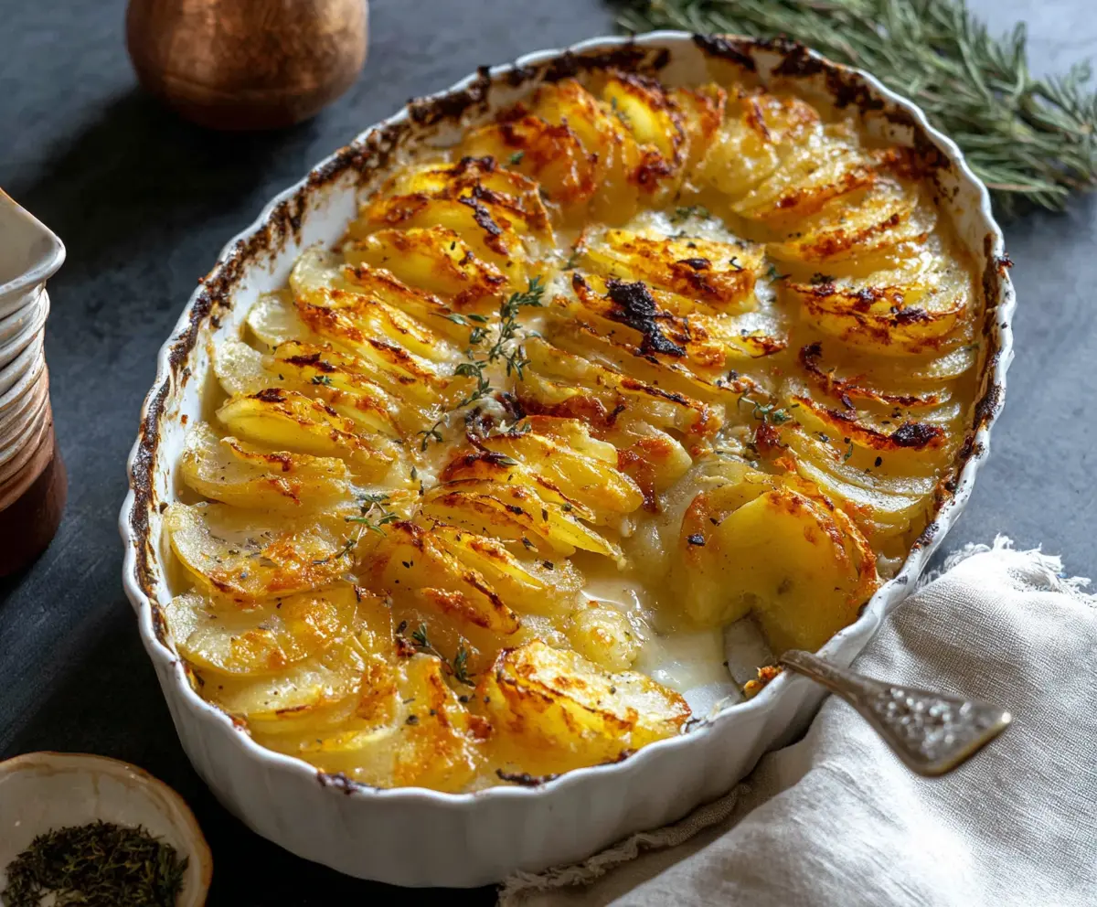 Before serving, garnish with fresh thyme leaves for a pop of color and a hint of flavor. Now, grab a spoon and dig into this comforting cheesy garlic butter potato bake!