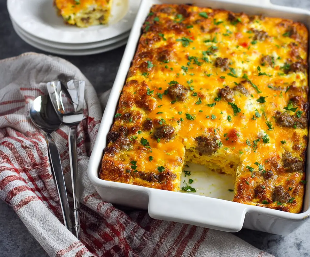This Cheesy Sausage Breakfast Casserole is a warm and filling dish that combines crispy sausage, fluffy eggs, and melted cheese. It’s like breakfast in a cozy blanket! 😋