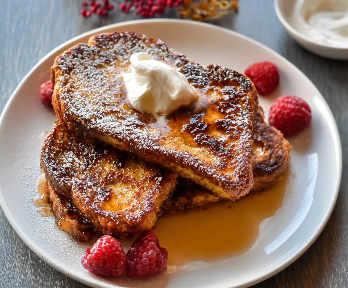 Once cooked, transfer the French toast slices to serving plates. Dust lightly with powdered sugar for a touch of sweetness. If you like, add a dollop of whipped cream or mascarpone and finish with a generous helping of fresh berries.
