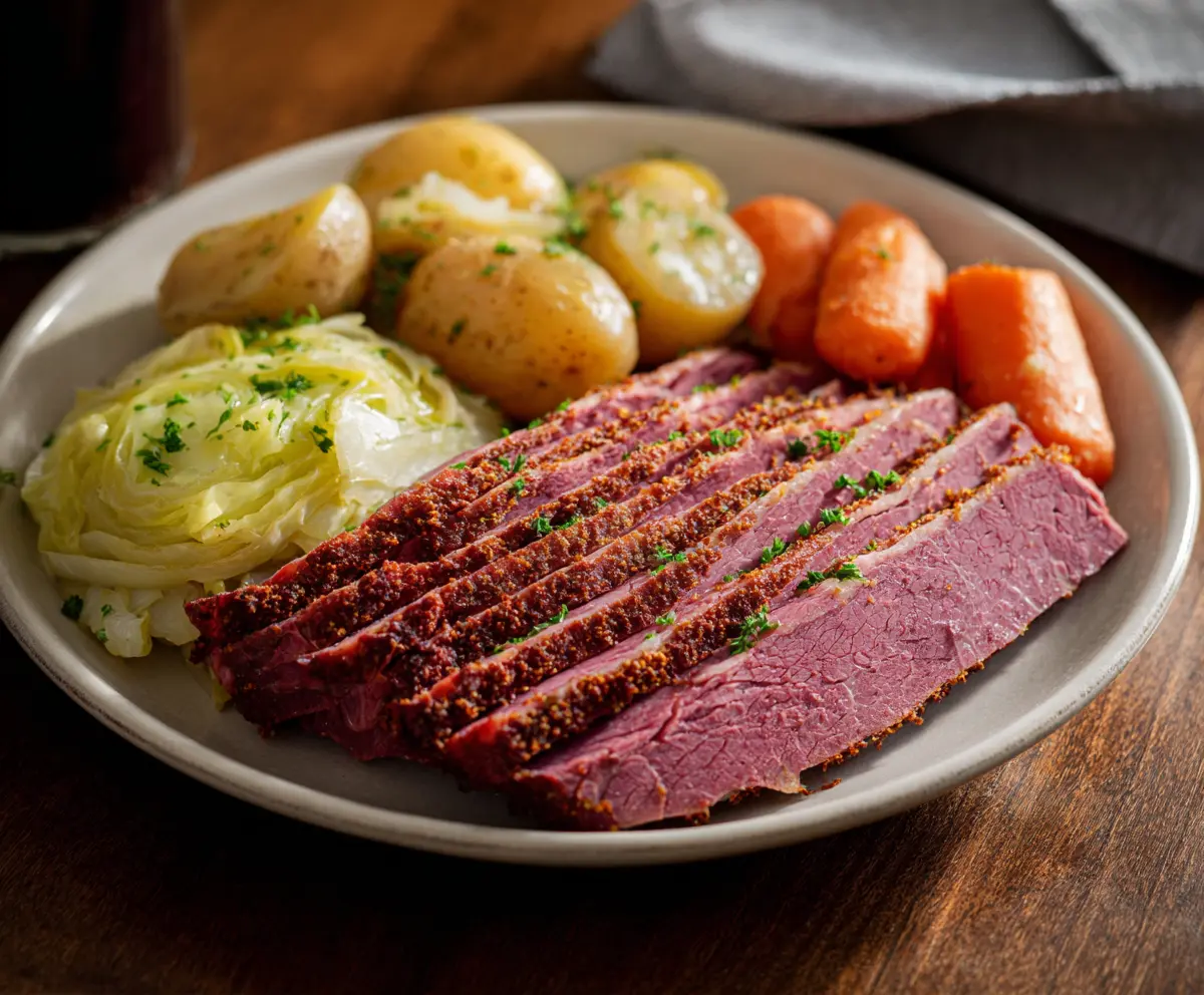 On a large plate, arrange your sliced corned beef along with the cabbage, carrots, and potatoes. Sprinkle chopped fresh parsley on top for a nice touch!