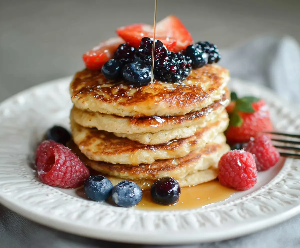 Now, it’s time to stack those fluffy pancakes on a plate! Top them generously with fresh mixed berries and banana slices. Drizzle on maple syrup or honey for an extra touch of sweetness. Enjoy your delicious, protein-packed cottage cheese pancakes!