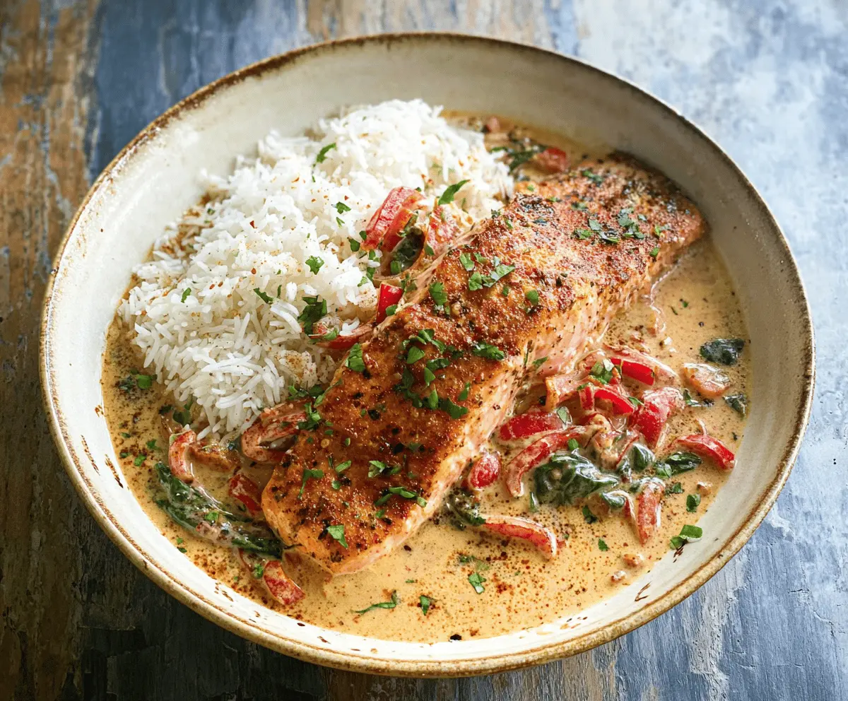 This Creamy Cajun Pepper Salmon is a tasty dish that features tender salmon coated in a rich and zesty sauce with a kick! It’s quick to whip up, making it perfect for busy nights.
