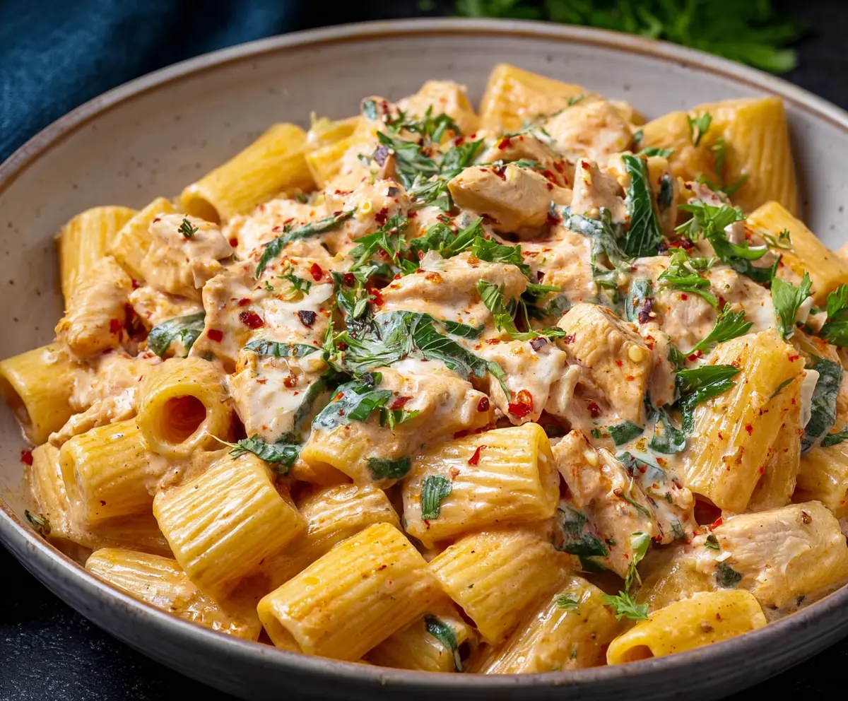 Dish out the creamy chicken rigatoni onto plates and garnish with freshly chopped parsley for a pop of color and freshness. Enjoy your comforting meal!