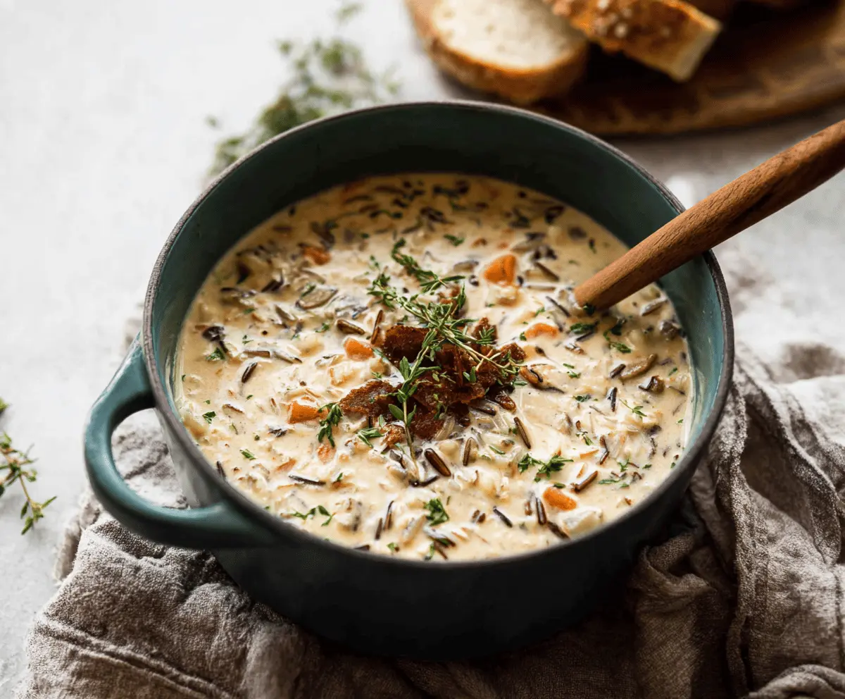 Once everything is well combined and heated through, take the pot off the heat. Ladle the soup into bowls and garnish with fresh parsley and, if you like, a sprig of thyme. Enjoy your warm bowl of creamy wild rice soup with some crunchy bread on the side!
