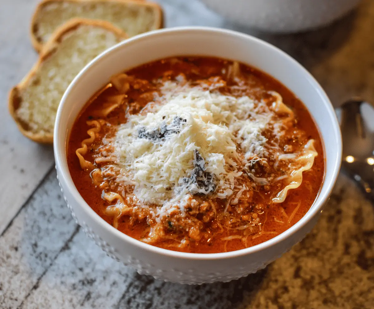 Enjoy your warm and comforting bowl of cheesy lasagna soup! It’s perfect for sharing on a chilly evening.