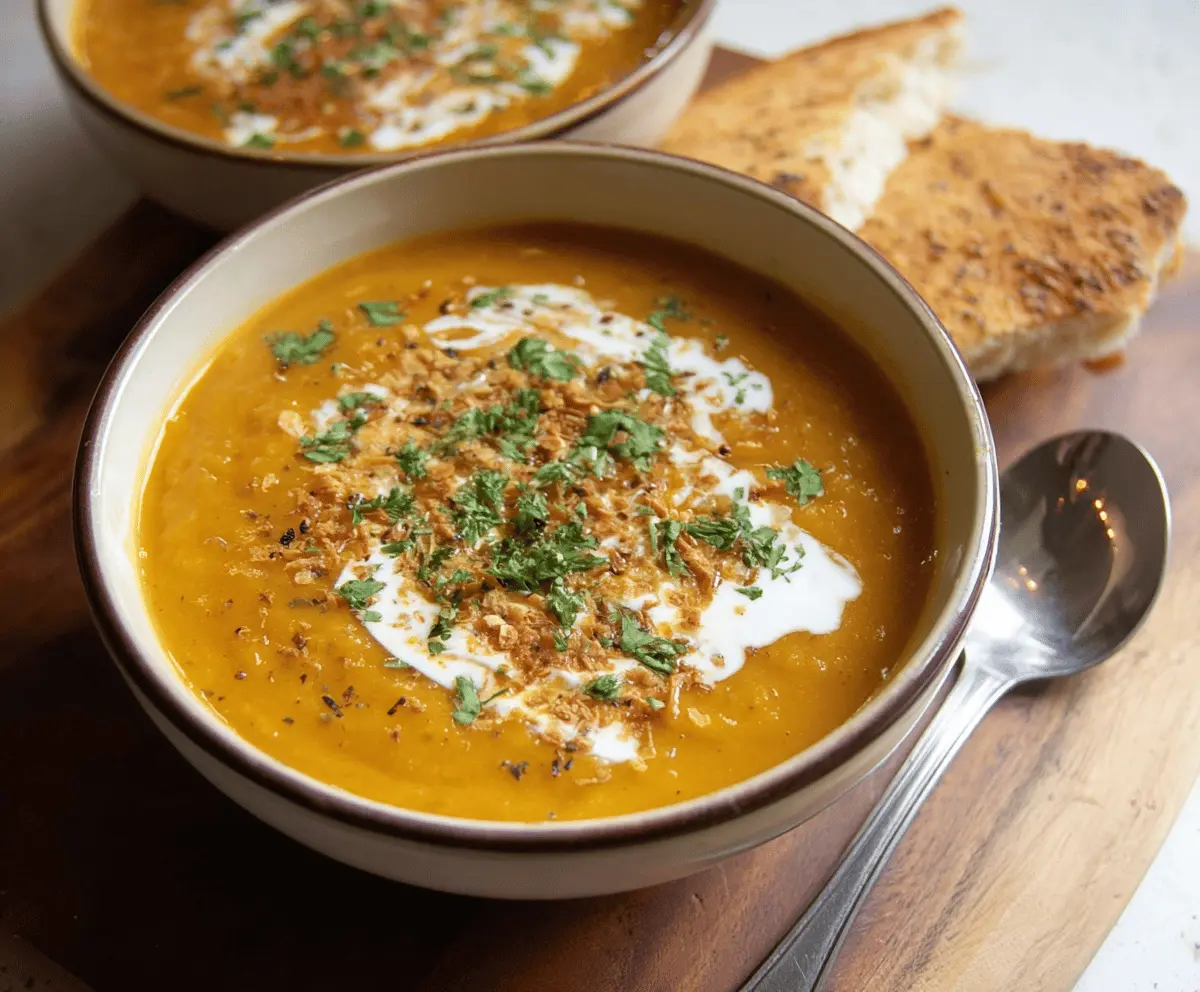 Ladle the soup into bowls and get fancy with your garnishes! Add a dollop of yogurt or sour cream, a sprinkle of chopped cilantro or parsley, and if you like, some toasted coconut flakes or crunchy fried onions on top.