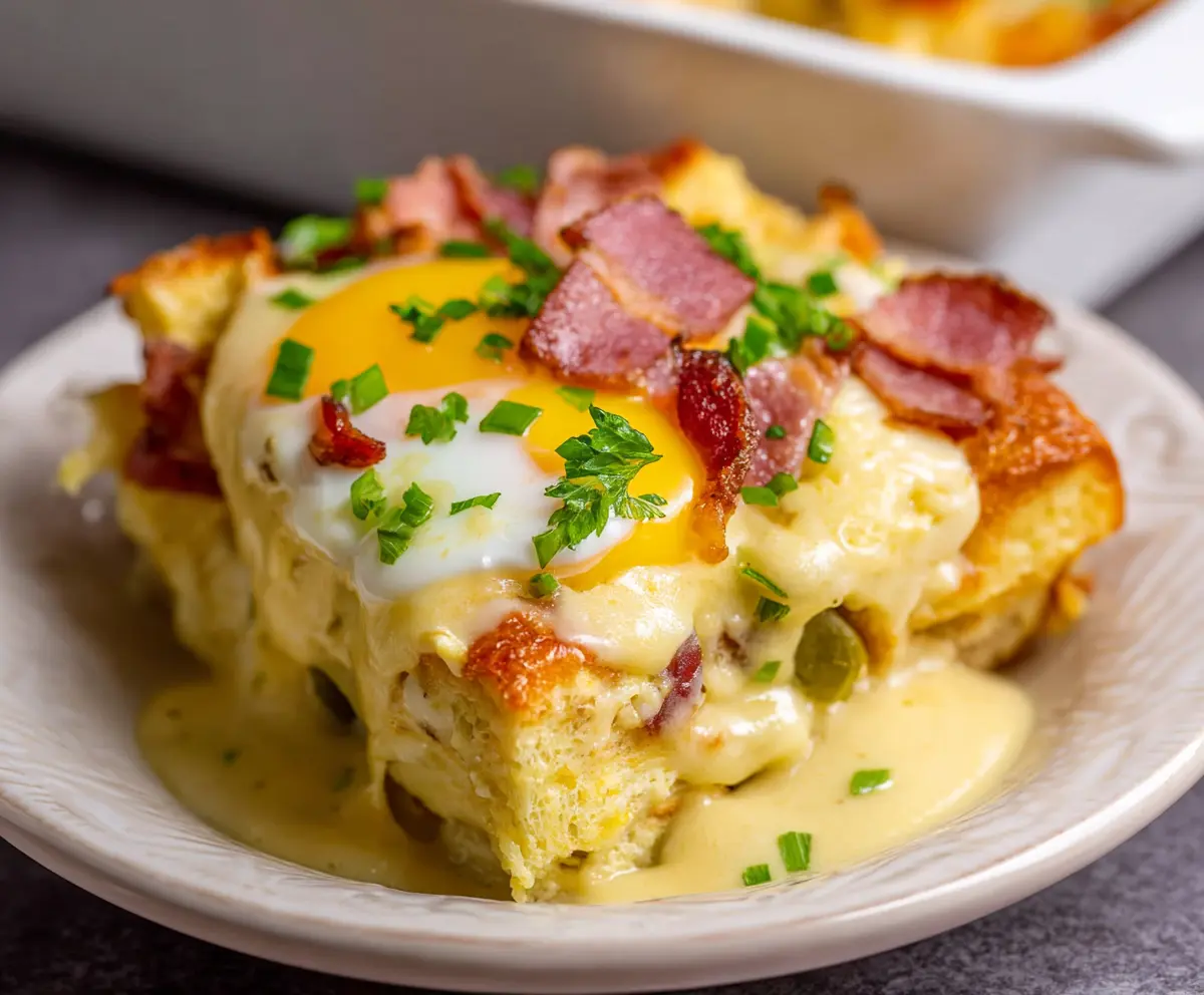 This savory casserole delivers the taste of classic Eggs Benedict with the ease of a baked dish. The creamy, cheesy custard-soaked bread with ham and bacon makes for a luscious breakfast or brunch treat.