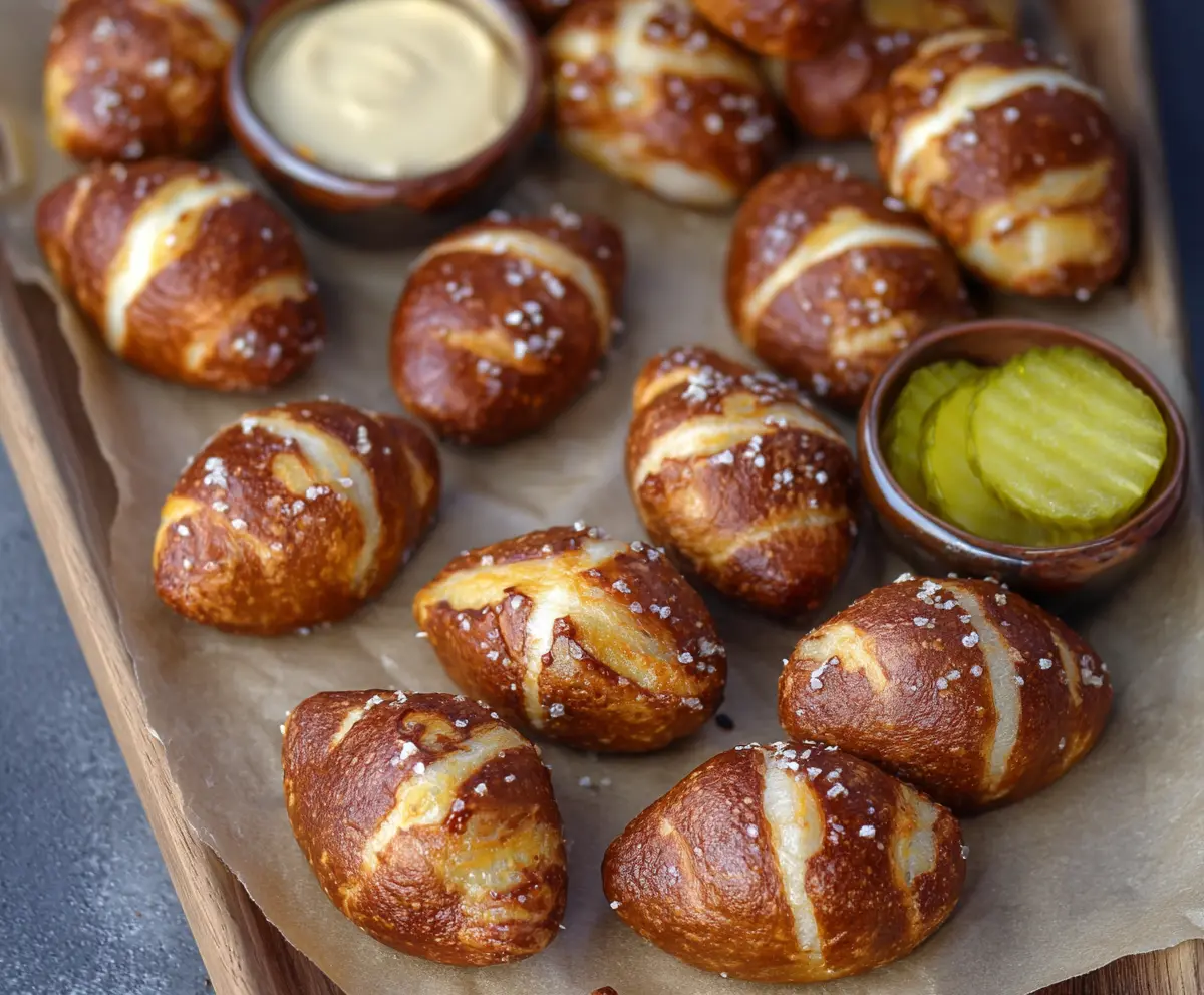 Once baked, remove the pretzel bites from the oven and let them cool slightly on a wire rack. Serve warm with your favorite dipping sauces, such as beer cheese or mustard, and garnish with pickle slices if desired.
