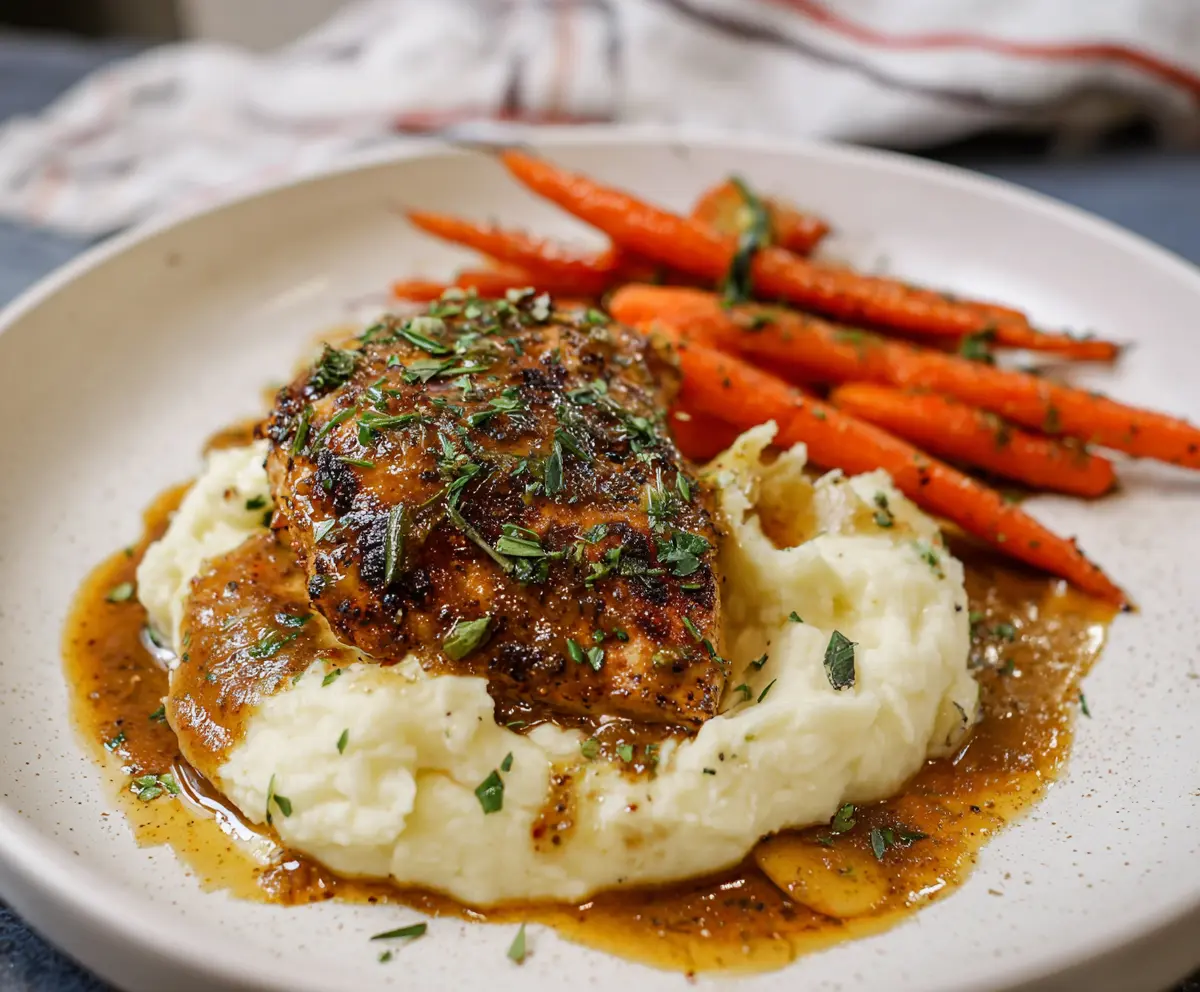 This Garlic Herb Chicken is juicy and packed with flavor, making dinner feel special. It’s perfectly paired with creamy mashed potatoes and sweet, shiny glazed carrots. Yum!
