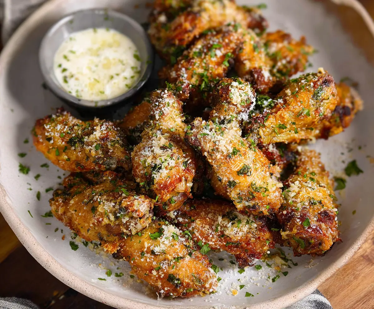 Transfer the wings to a serving plate, and if you’d like, garnish with a little extra Parmesan and parsley on top. Serve them warm with ranch or blue cheese dressing on the side for dipping. Enjoy every crunchy, flavorful bite!