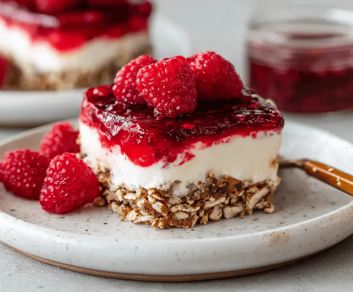 This is where patience comes into play! Cover the dish and refrigerate for at least 4 hours, allowing the gelatin to set fully. Once it’s ready, feel free to top it with the remaining fresh raspberries before serving. Cut into squares and enjoy your refreshing gluten-free dessert with friends and family!
