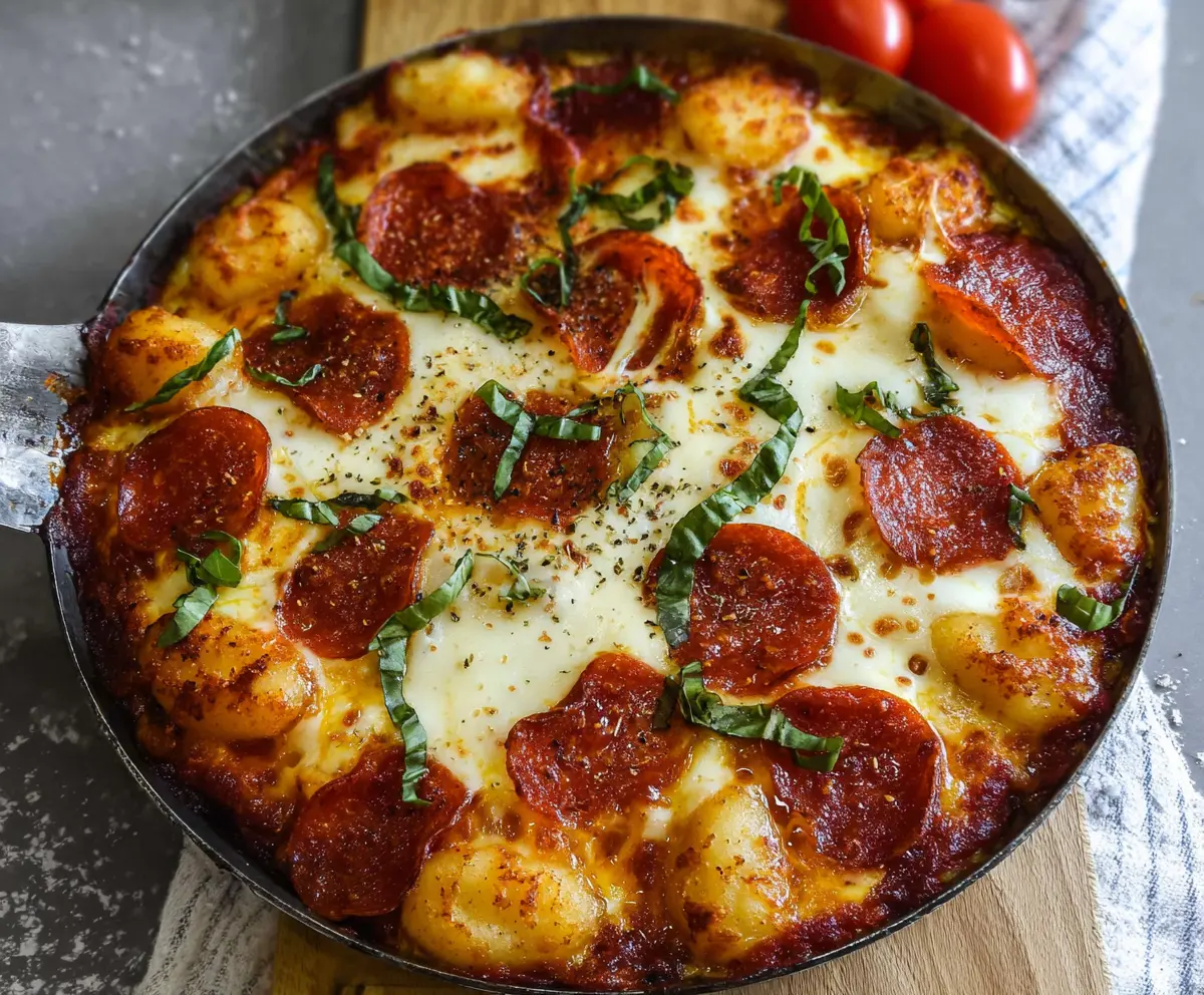 Once the gnocchi are golden, remove the skillet from heat. Spread the pizza sauce evenly over the gnocchi. Now, layer the sliced fresh mozzarella on top of the sauce, followed by the pepperoni slices (or whatever toppings you like).