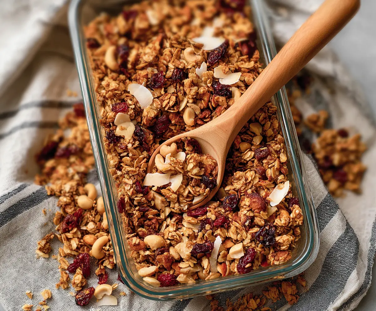 This healthy granola is a tasty mix of oats, nuts, and sweet honey. It’s perfect for breakfast or a quick snack, giving you energy without all the added sugar.