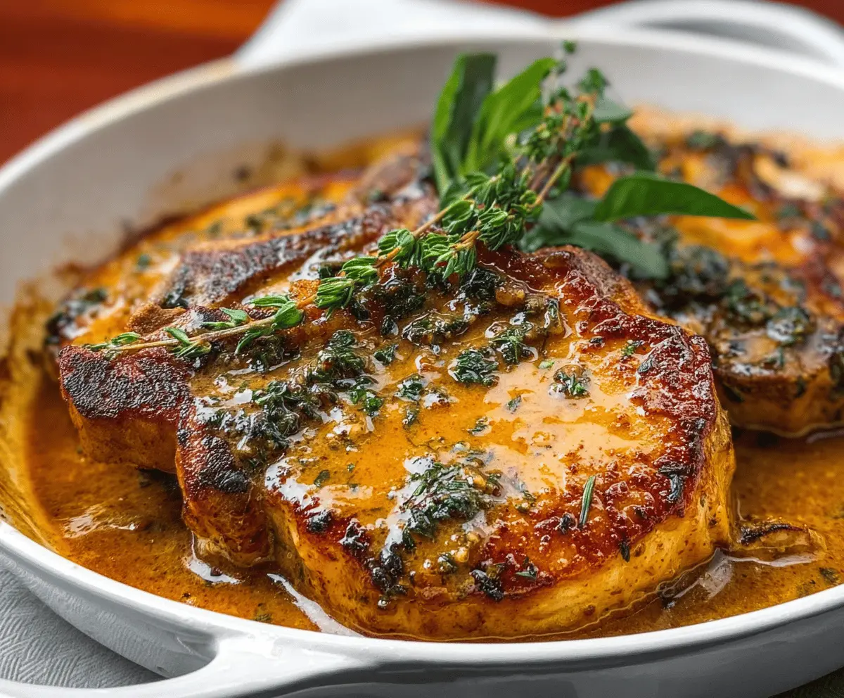Return the seared pork chops back into the skillet and spoon the honey mustard sauce over them. Cook for another 1-2 minutes to warm the chops and let those flavors blend. Finally, remove from heat, garnish with fresh thyme sprigs, and they’re ready to be served!