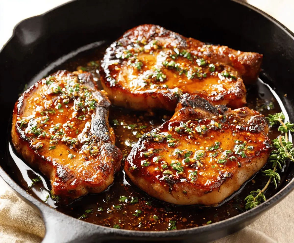 Remove the skillet from the heat and garnish your juicy pork chops with fresh herbs like thyme and rosemary sprigs. Serve them warm, drizzled with any remaining glaze from the pan.