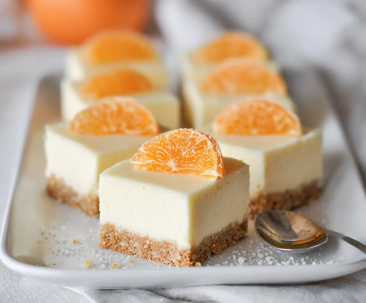 Once your cheesecake bars are chilled, carefully lift them out of the pan using the parchment overhang. Cut into squares and garnish each bar with a fresh orange or mandarin segment and a sprinkle of graham cracker crumbs if you like. Serve these bright and creamy Orange Creamsicle Cheesecake Bars chilled, and watch them disappear!