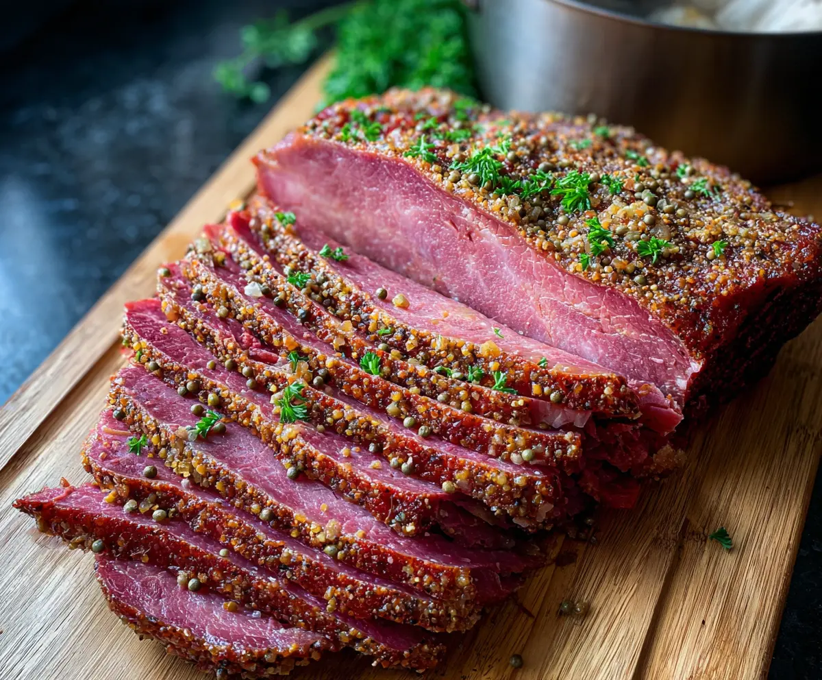 Using a sharp knife, slice the brisket thinly against the grain. Garnish with freshly chopped parsley for a pop of color and flavor. Serve warm alongside your favorite sides like roasted vegetables or cabbage. Enjoy your beautifully crusted, tender, and flavorful oven roasted corned beef!