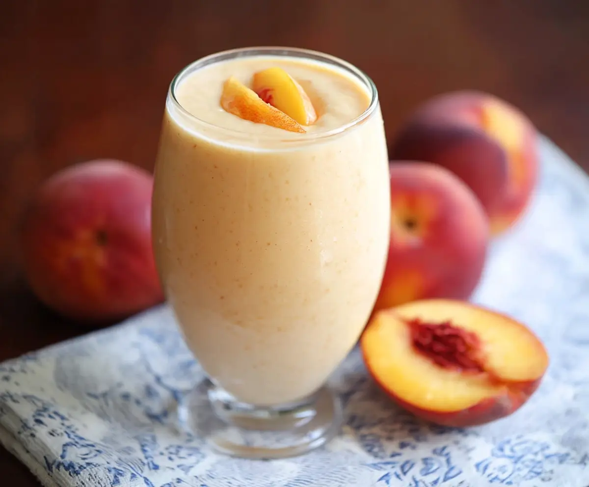 In a blender, toss in the peach slices along with the Greek yogurt, milk, protein powder, and honey or maple syrup if you like it sweeter. This combination is where the magic happens!