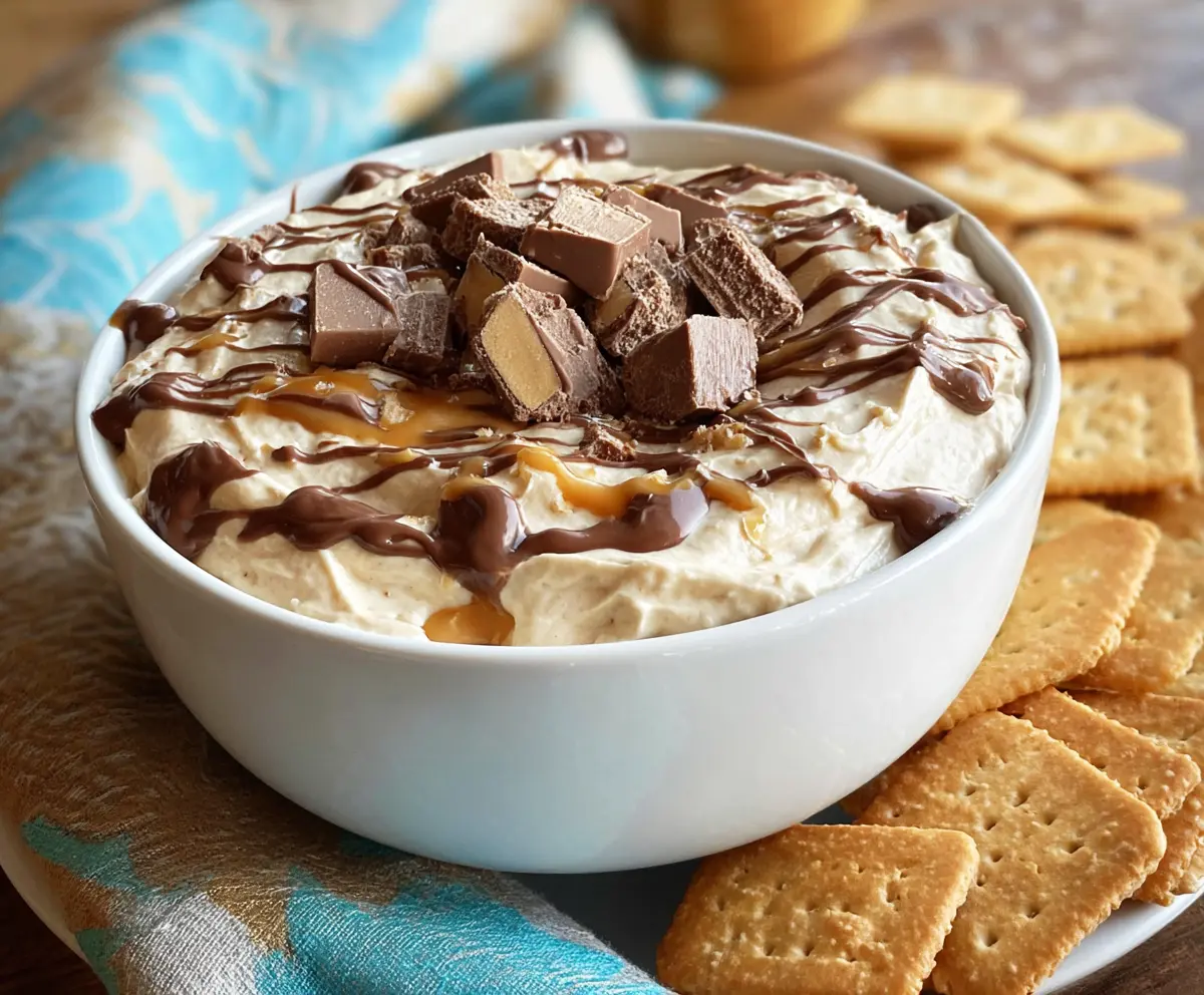 Transfer the dip into a serving bowl. Drizzle chocolate syrup over the top in a fun swirl. It makes it look lovely! Sprinkle the chopped peanut butter chocolate candy bars on top for a delicious finish.