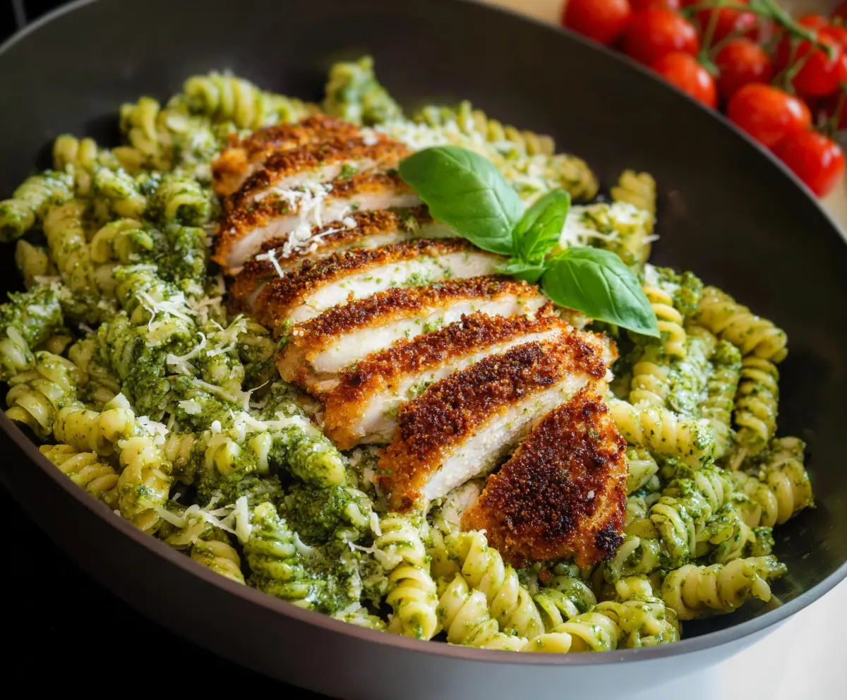 Now it’s time to serve! Plate the pesto pasta and place the crispy Parmesan chicken cutlets right on top. For that finishing touch, sprinkle some additional grated Parmesan cheese and fresh basil leaves on top. It makes everything look inviting!