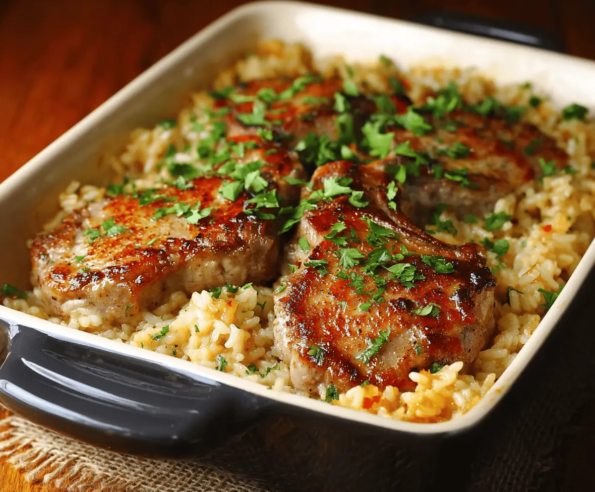 This Pork Chops and Rice Casserole is a total comfort food! Juicy pork chops sit on a cozy bed of fluffy rice, all baked together in a creamy sauce that’s hard to resist.