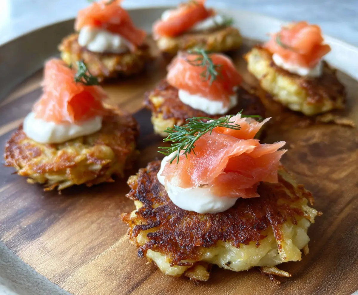 These crispy potato latke bites are a fun twist on the traditional dish! Topped with delicious smoked salmon, they make a perfect snack or fancy appetizer.