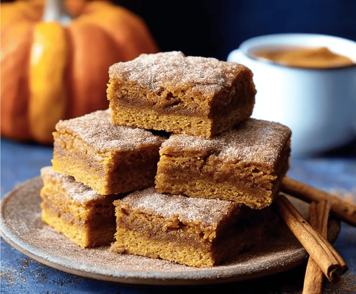 These Pumpkin Snickerdoodle Bars are the perfect fall treat! With a soft, spiced pumpkin base and a sprinkle of cinnamon sugar on top, they are both tasty and cozy.