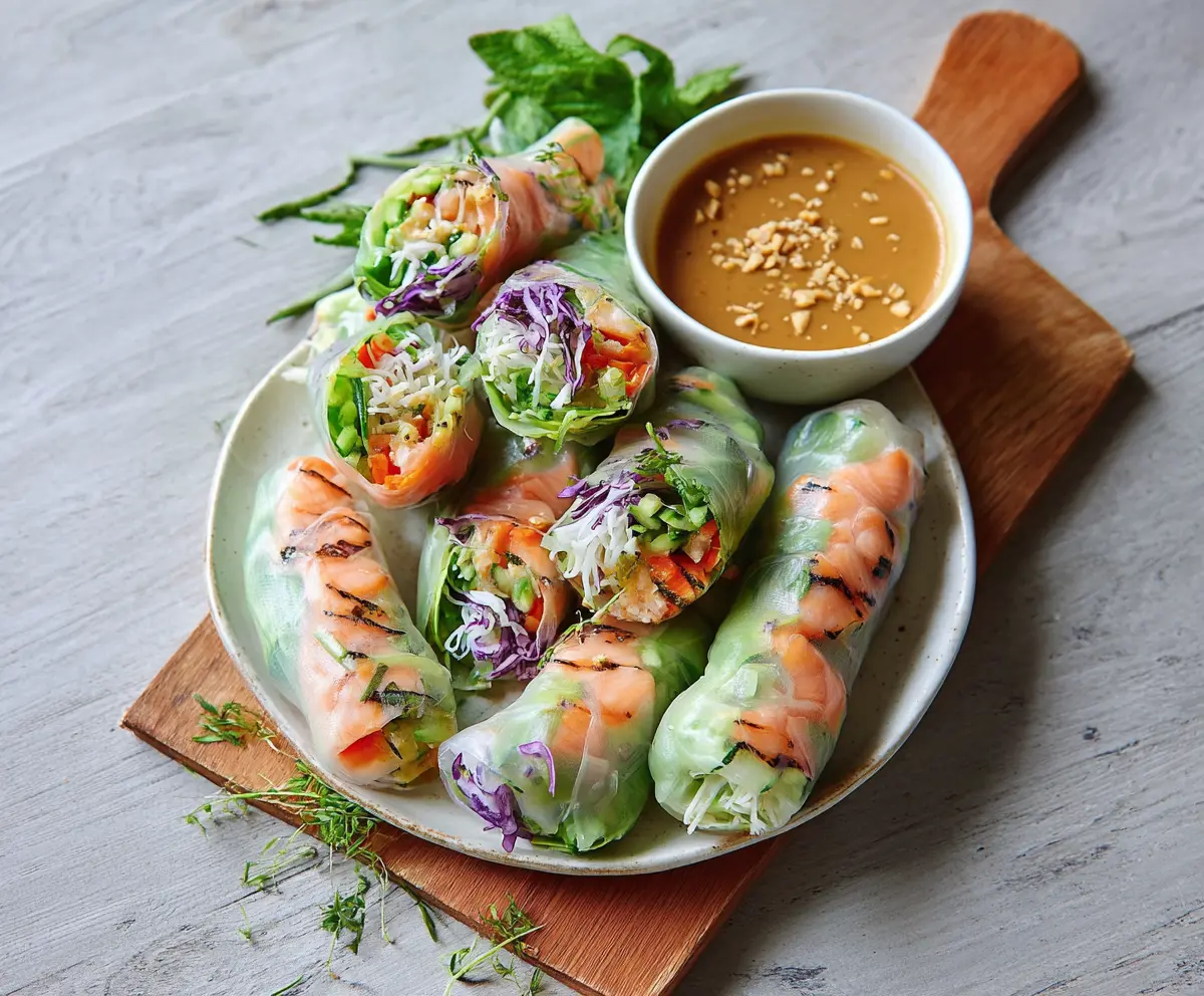 Enjoy your fresh and vibrant Salmon Fresh Spring Rolls with the rich, flavorful peanut sauce!