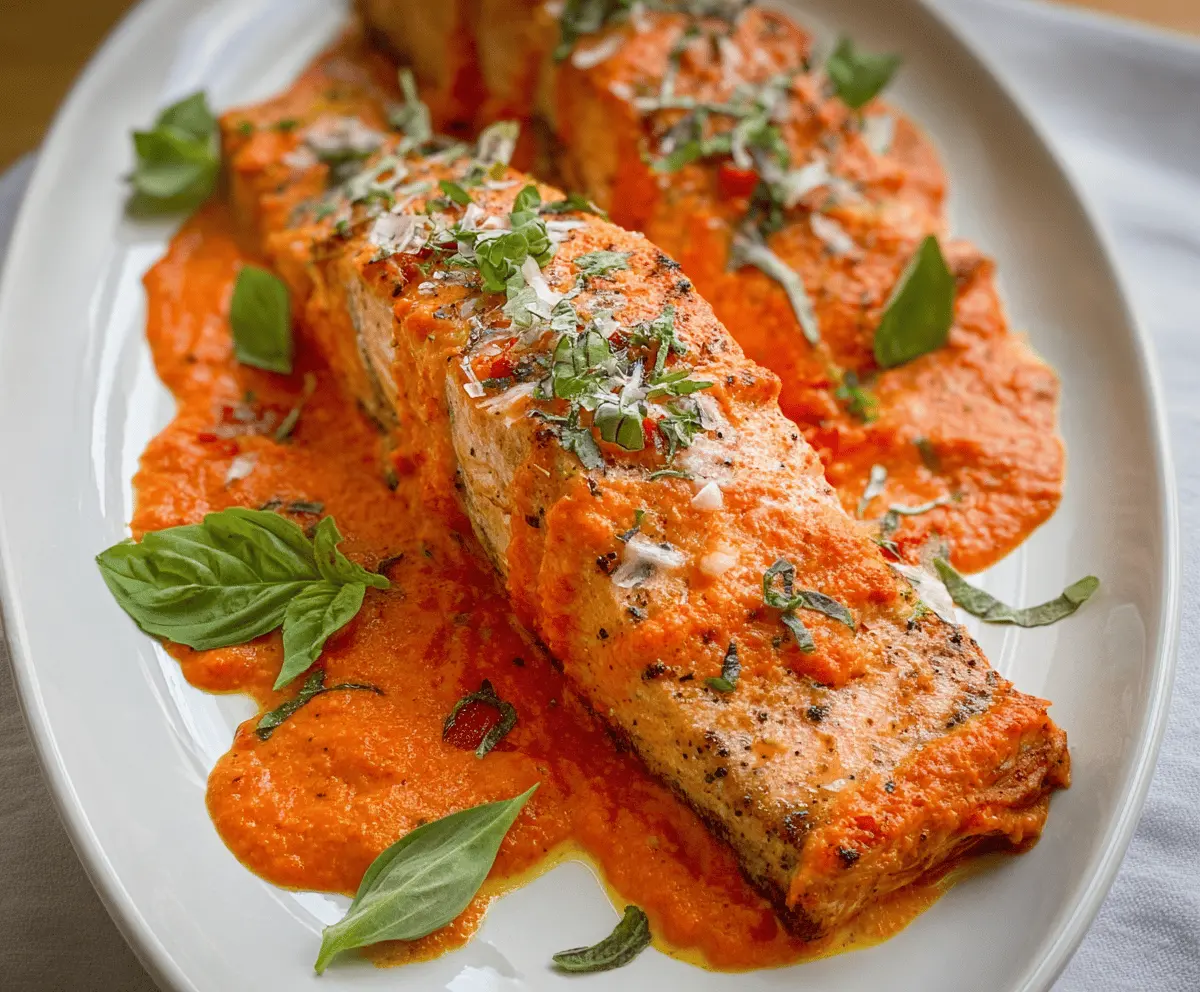 Serve immediately with your favorite sides, such as rice, potatoes, or steamed vegetables. Enjoy your delightful salmon with a creamy roasted red pepper sauce!