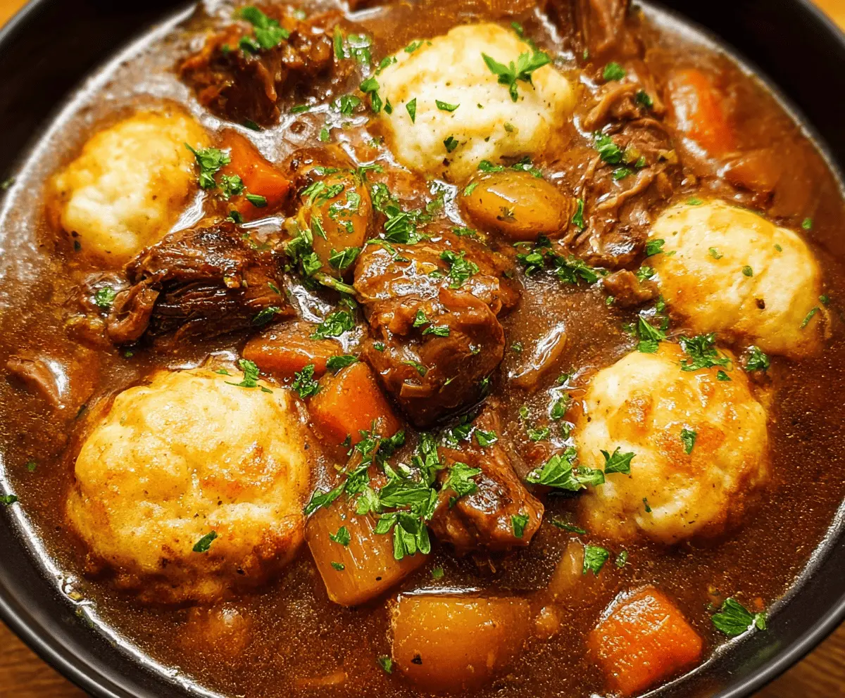 This recipe creates tender, flavorful beef and veggies in a rich broth, topped with light, fluffy herbed dumplings—a true comfort food classic!