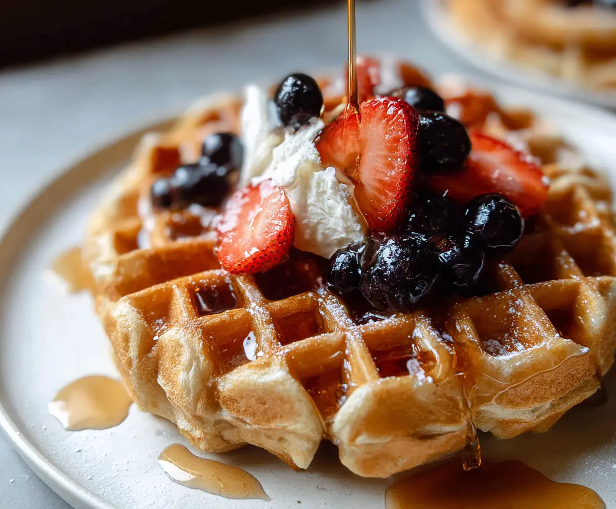 Once cooked, carefully transfer the waffles to a plate. Top them with fresh blueberries, banana slices, a dollop of whipped cream or a scoop of vanilla ice cream, and drizzle generously with maple syrup for that perfect finish!