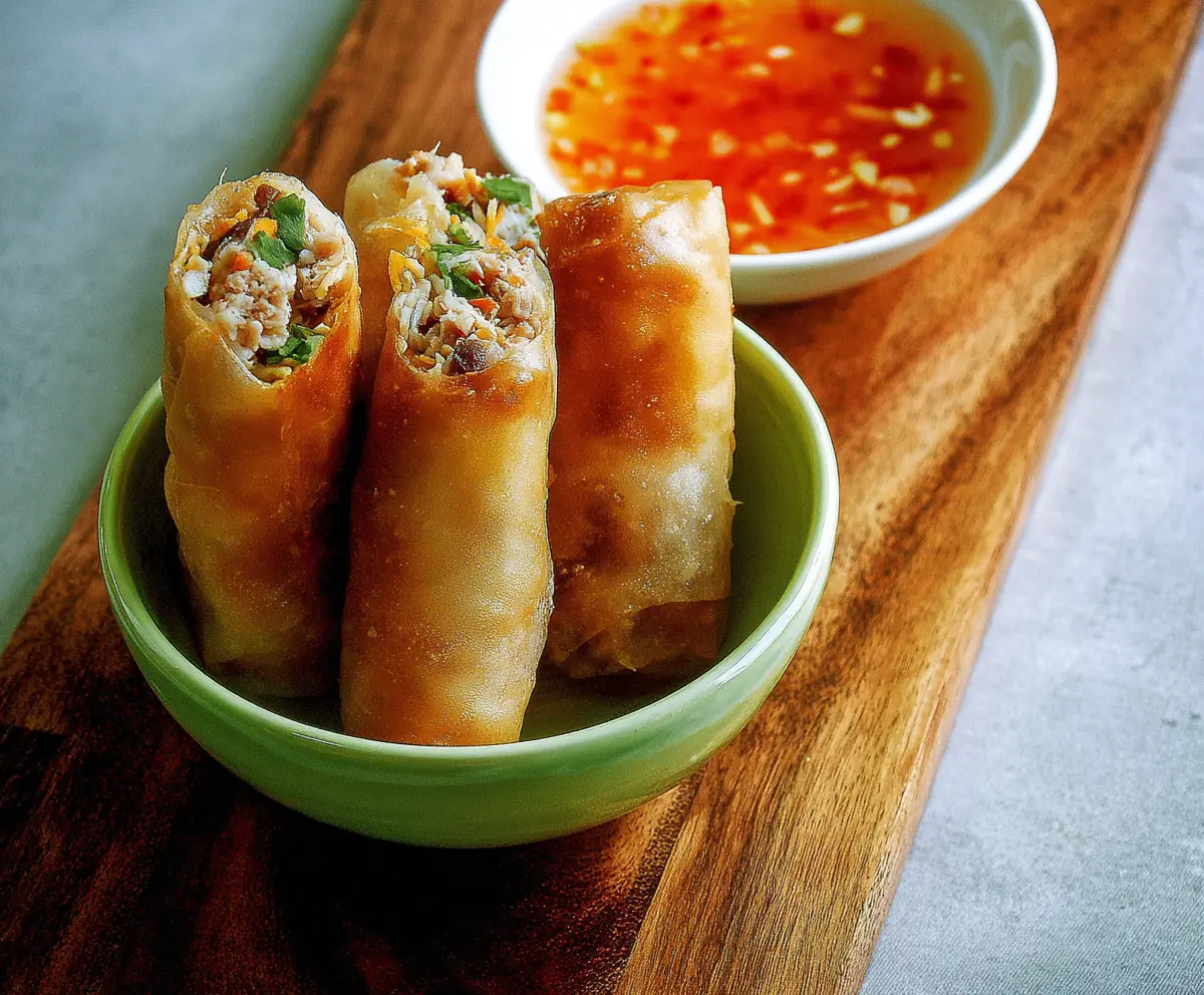 This delicious recipe takes about 30 minutes to prepare, plus an extra 10-15 minutes for frying. So, in just under an hour, you’ll enjoy crispy, flavorful Thai chicken spring rolls paired with homemade sweet chili sauce!