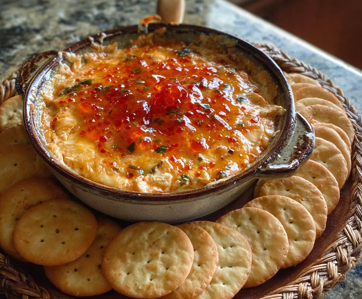 Serve the dip warm with an assortment of crackers for dipping. It’s creamy, tangy, with a sweet-spicy kick—sure to be a hit!