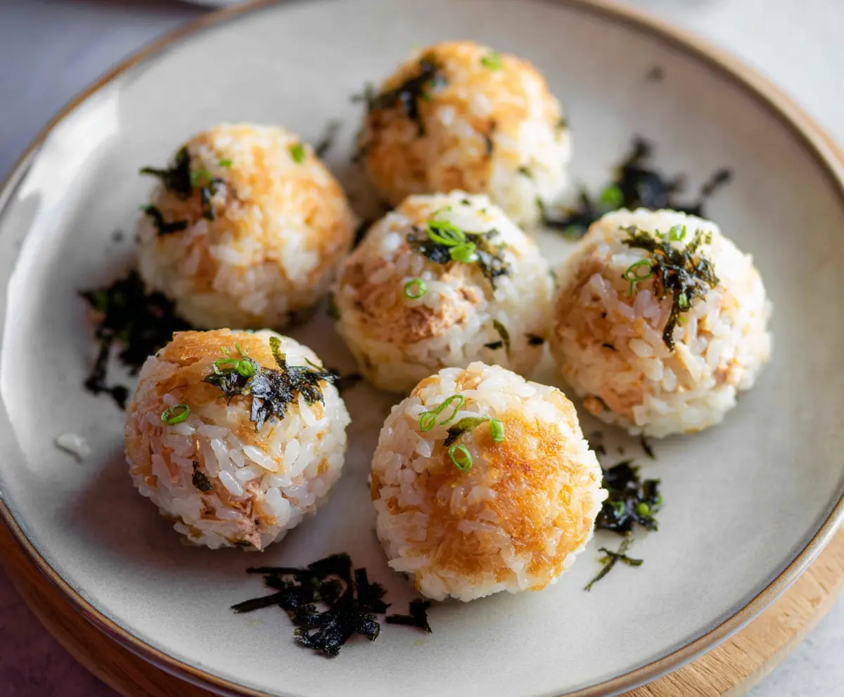 Once they’re beautifully golden, remove the rice balls from the pan and place them on a serving plate. You can garnish with extra chopped chives or parsley and sprinkle some chili sauce or furikake on top if you like a bit of spice.