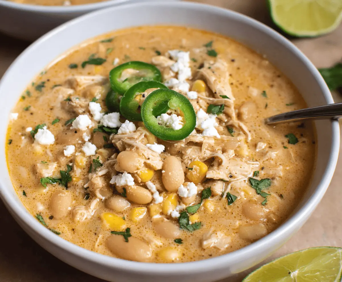 This warm and comforting white chicken chili is packed with tender chicken and beans. The creamy broth, flavored with mild spices, makes it a bowl of happiness!